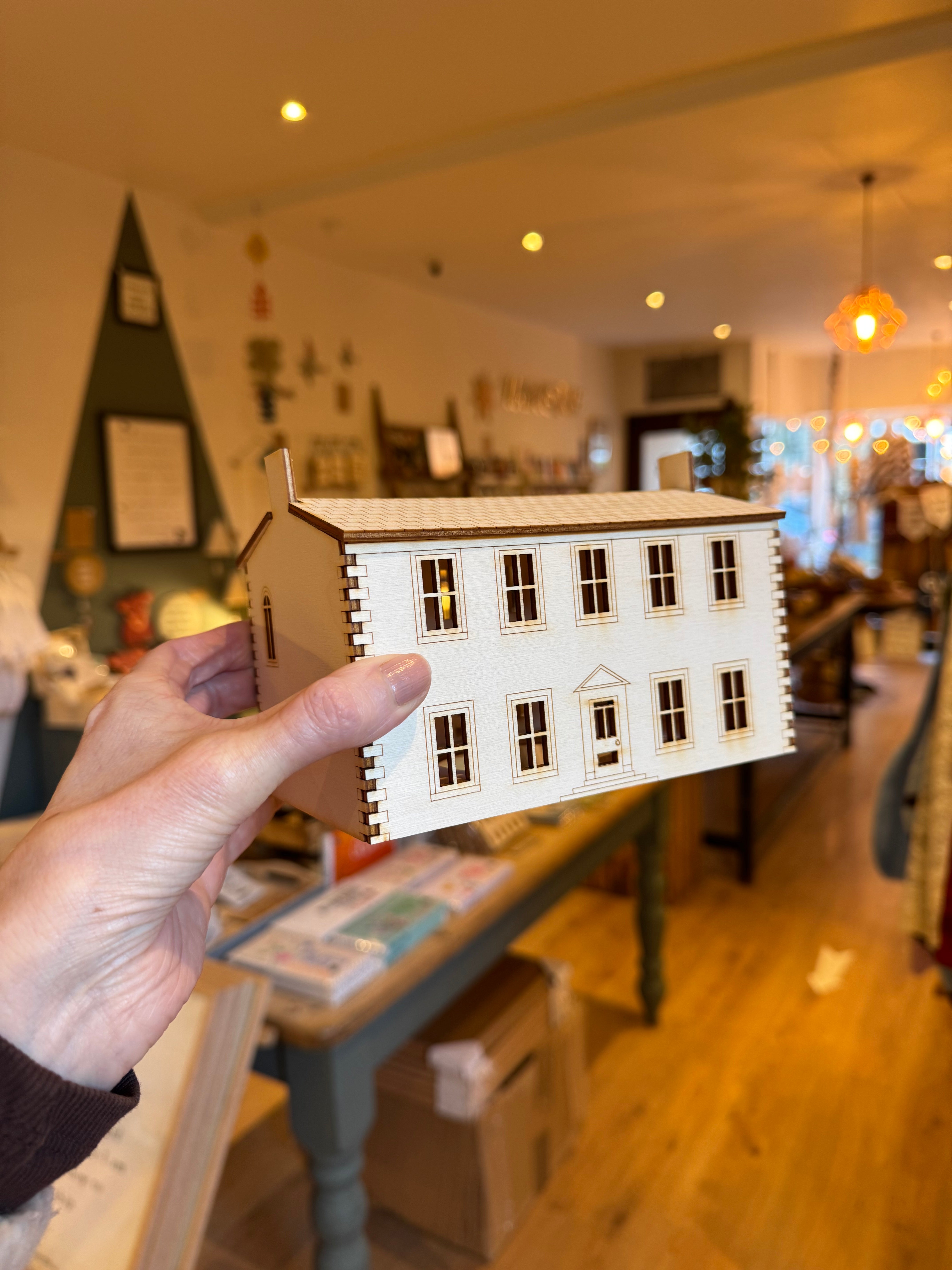 Designed and cut in Haworth, the village the Bronte Sisters grew up in. Easy to construct, ideal as a little night light or book shelf light.