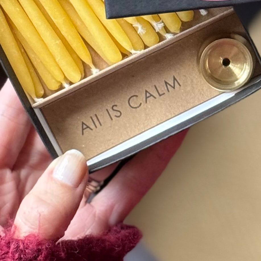 Each set includes 25 beeswax candles with a lovely honey scent and a brass stand. The candles burn cleanly and come in a black presentation box with instructions for use.