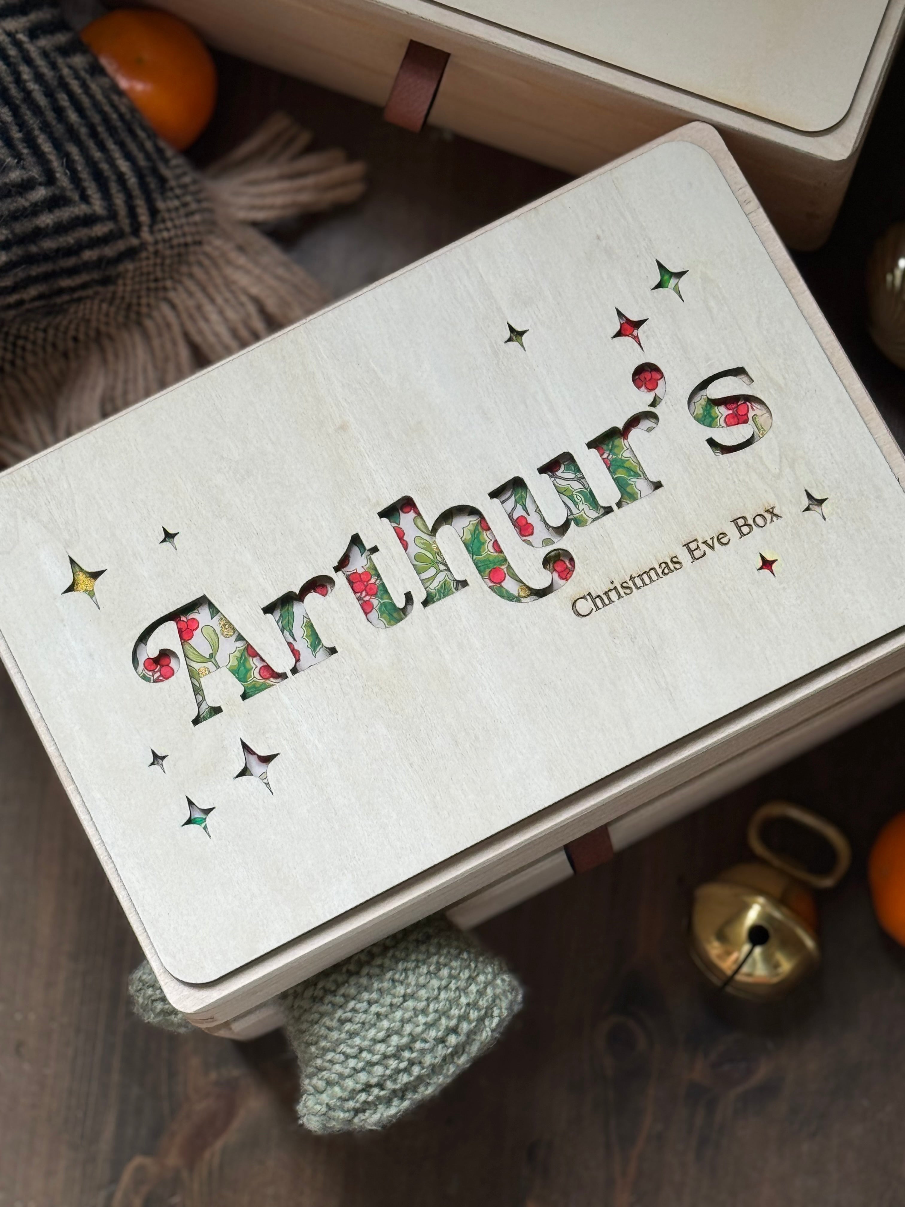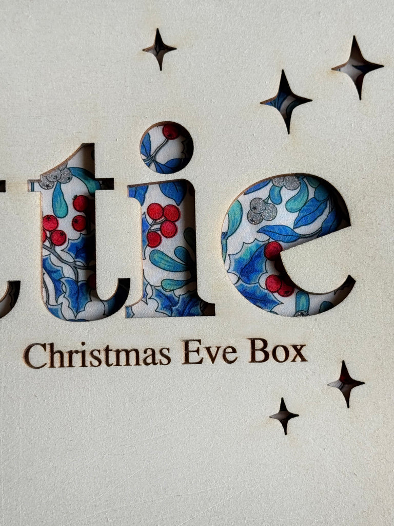 Wooden and Fabric Layered Name Christmas Eve Box - green berry liberty is backordered and will ship as soon as it is back in stock.