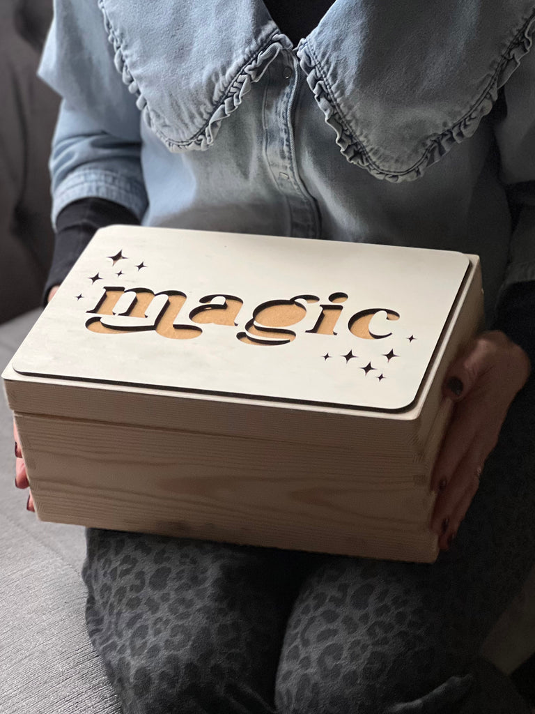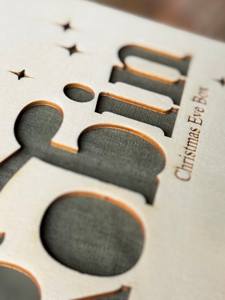 Your box is made from pine and is untreated. Please note that due to the nature of wood, small imperfections and differences in grain, knots, colour etc may occur. The layered design is made from birch ply with a cut out name or word over a liberty fabric peekaboo background.