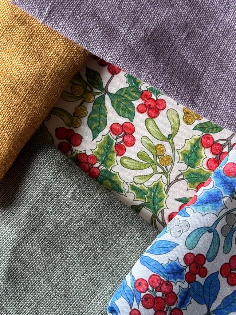 Liberty fabric shows holly, mistletoe and berries in a repeat pattern. The linens are all lovely quality muted colours, perfect for a more quiet, understated Christmas vibe.