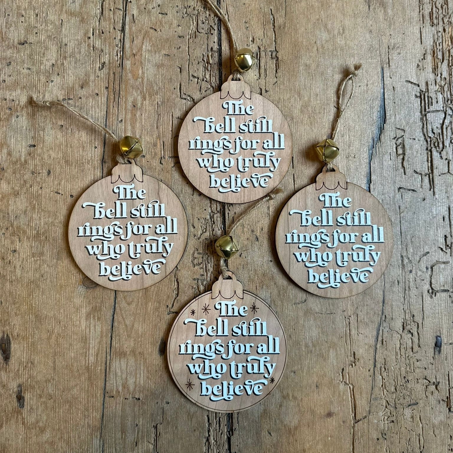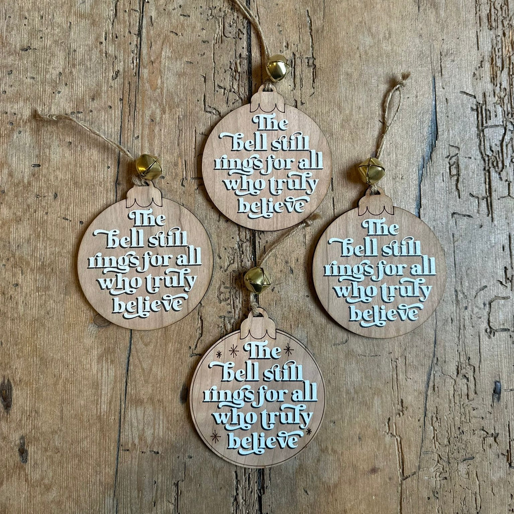 Made from Birch Ply and printed with the words ‘the bell still rings for those who truly believe’ your wooden bauble includes a bell that jingles and is strung in brown chord.