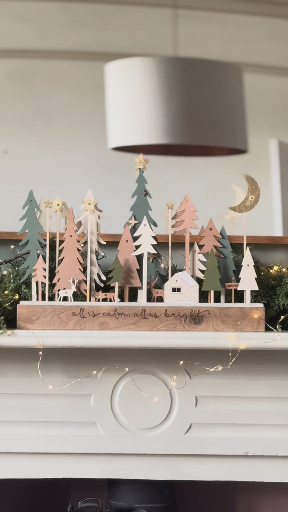On a recycled, solid oak, wooden base with a selection of winter pine trees, a fox, deer, a north pole sign, a few stars and a Christmas eve tree with gold star. Can be used year after year and arranged any way your heart desires!
