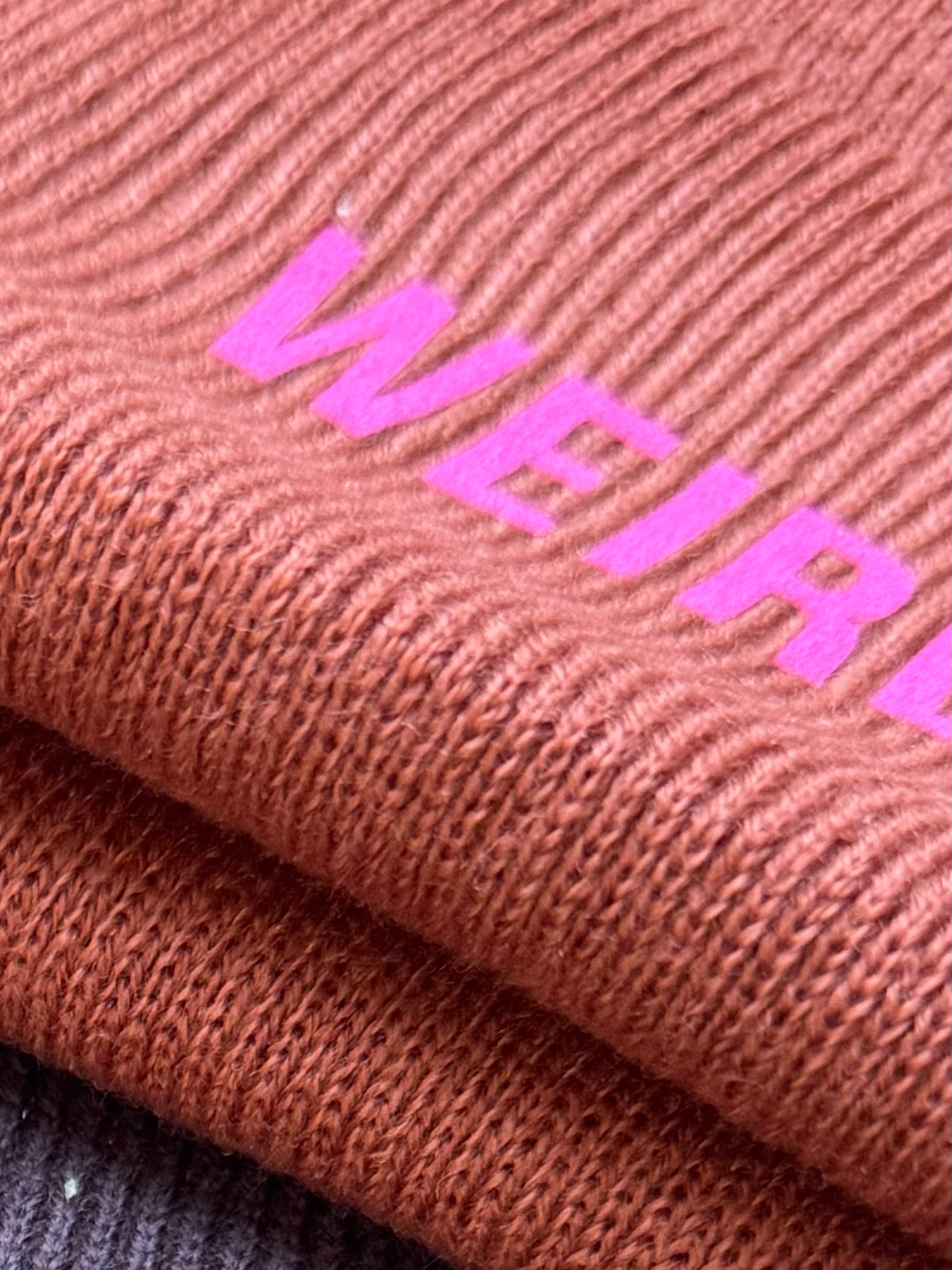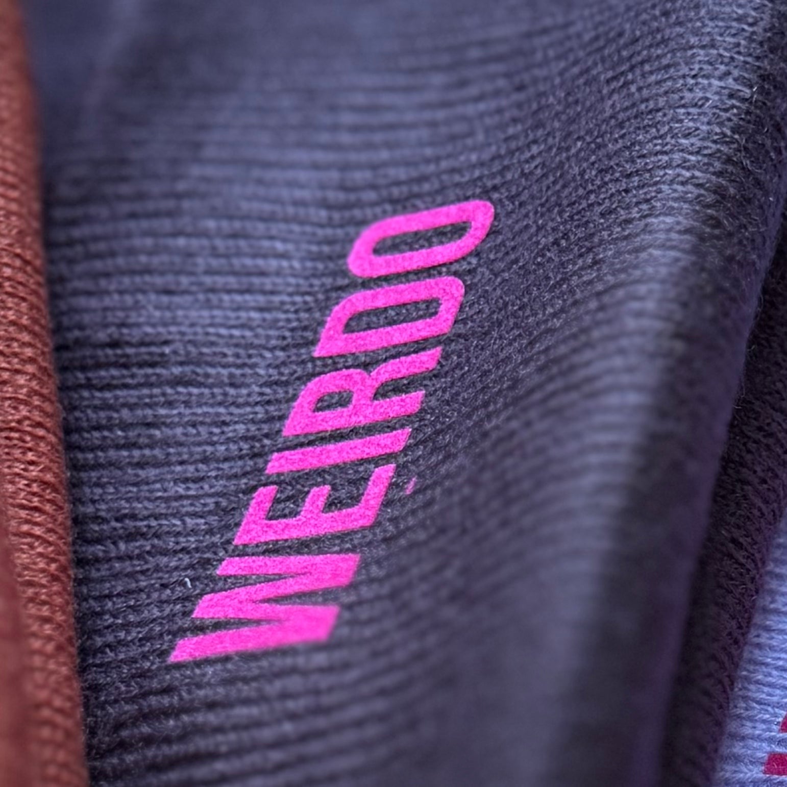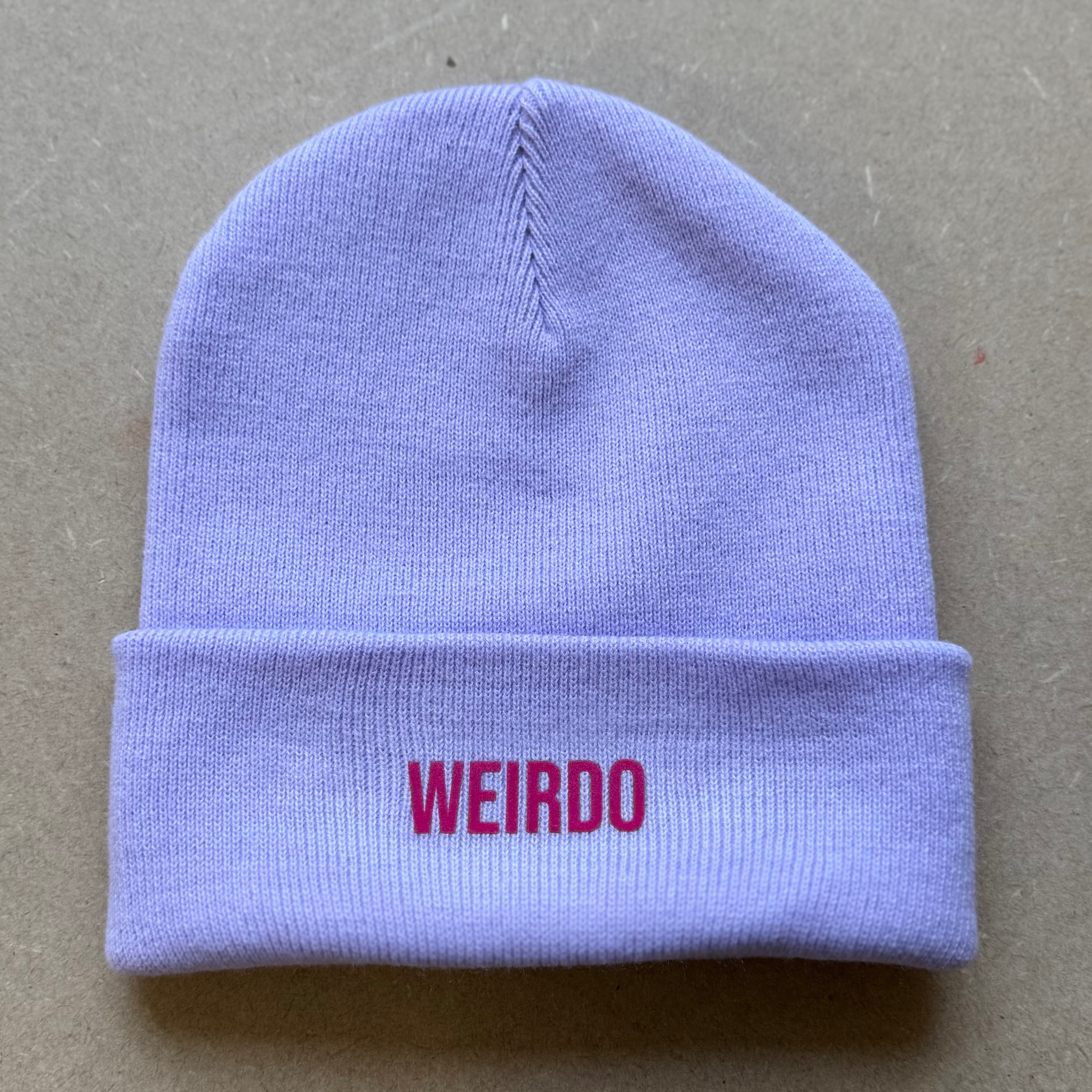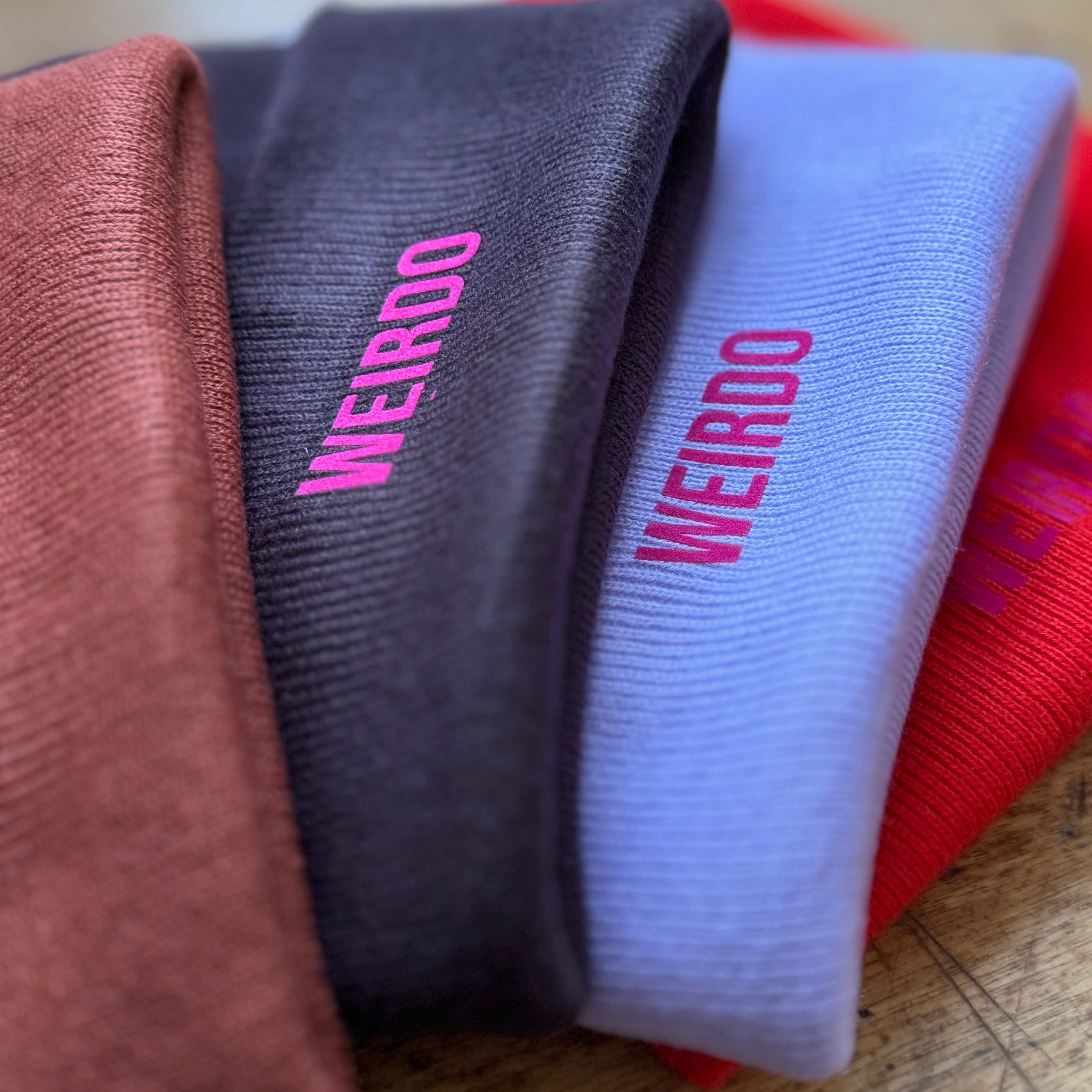 One size, cuffed beanie hat in 4 colours with the word WEIRDO printed in pink.