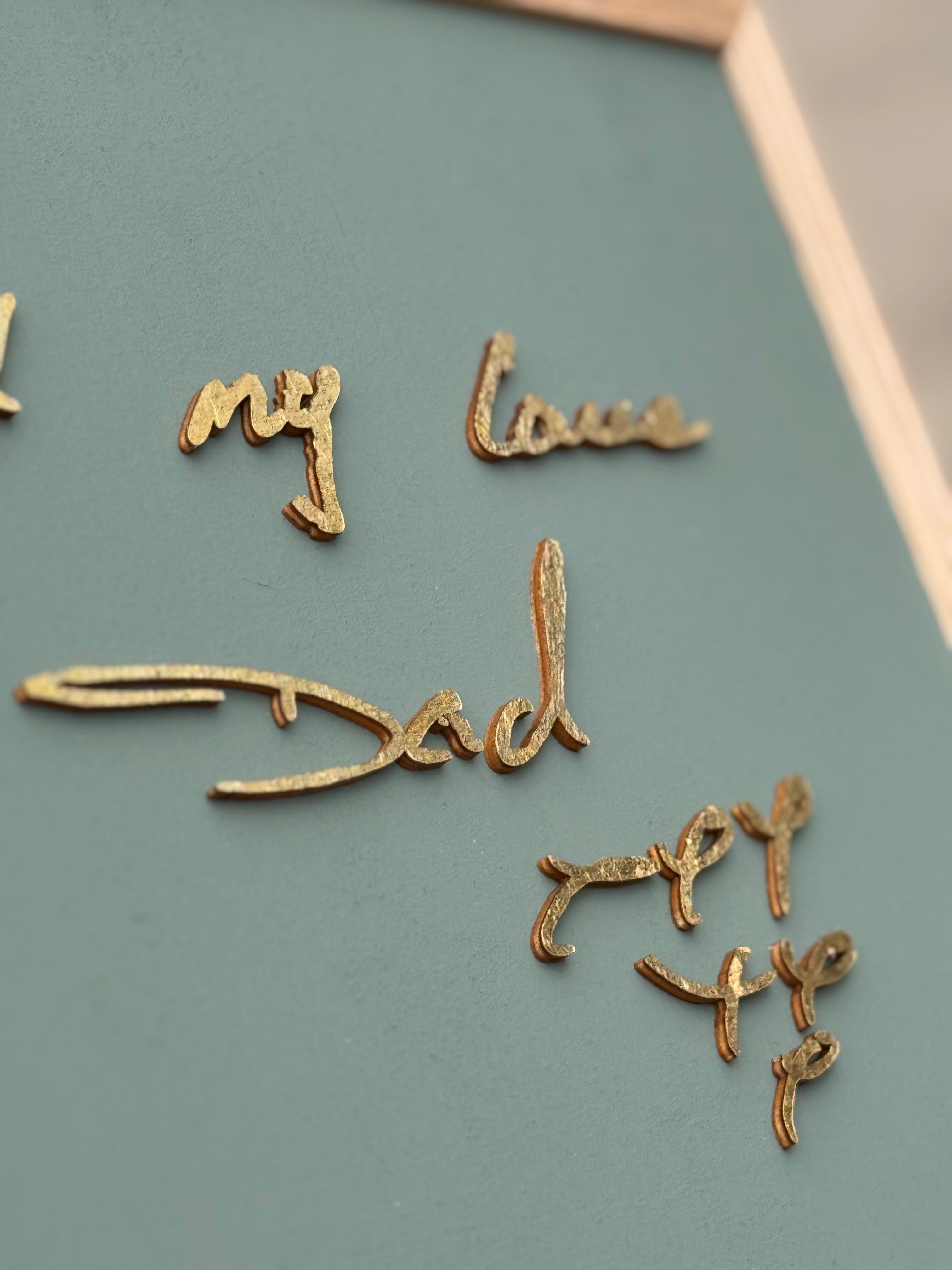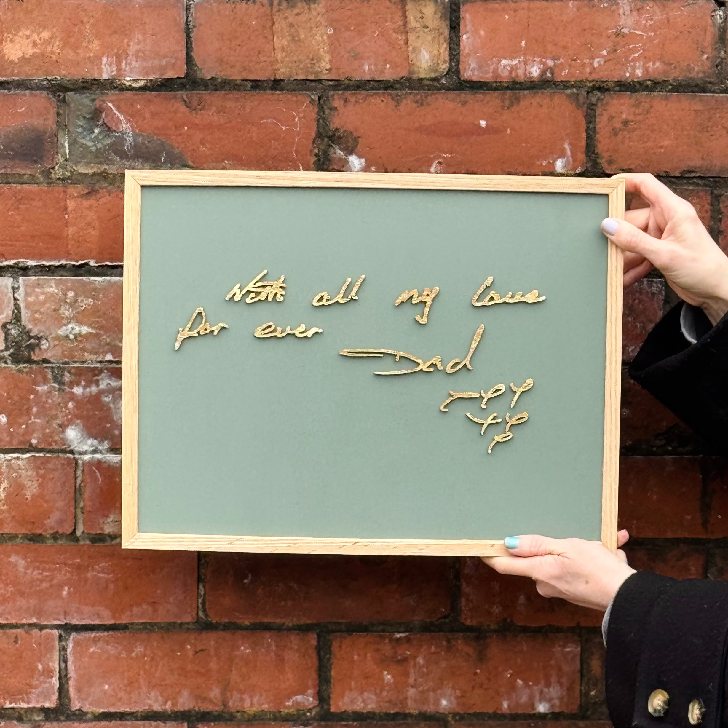 Hand-painted in a background colour of your choice, we will turn your provided handwritten text into a piece of art to be enjoyed forever. Made from wood and cut from oak veneer, each letter is fixed into place by hand before being framed in a solid oak frame.
